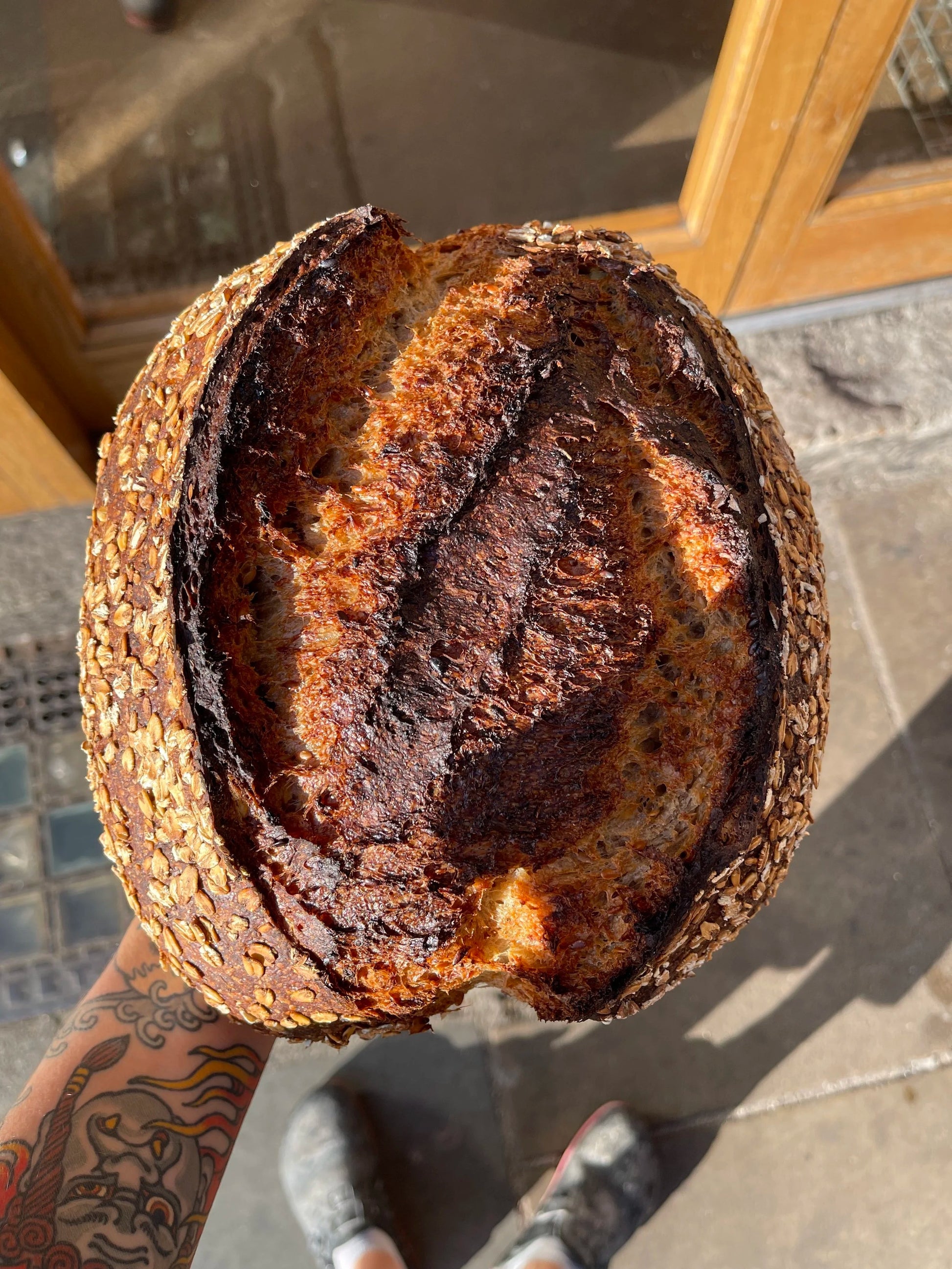 Stock up on our oat porridge sourdough before the weekend! Made with organic white flour milled and sifted in Somerset, 20% wholegrain wheat grown and milled in the Cotswolds, organic British jumbo oats and golden linseeds . Come and collect between 8am-5pm on Thursday.